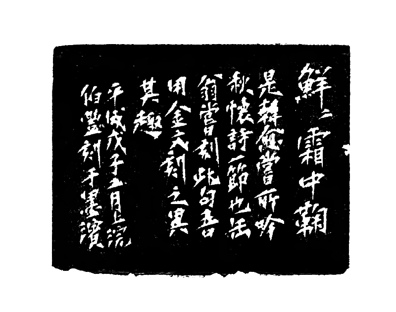 鮮鮮霜中鞠 是韓愈嘗所吟秋懐詩一節也。缶翁嘗刻此句。吾用金文刻之異其趣。平成戊子二月上浣伯豊刻于墨濱。